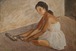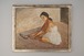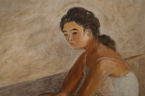 なんとも言えない表情で床に座る女性。
