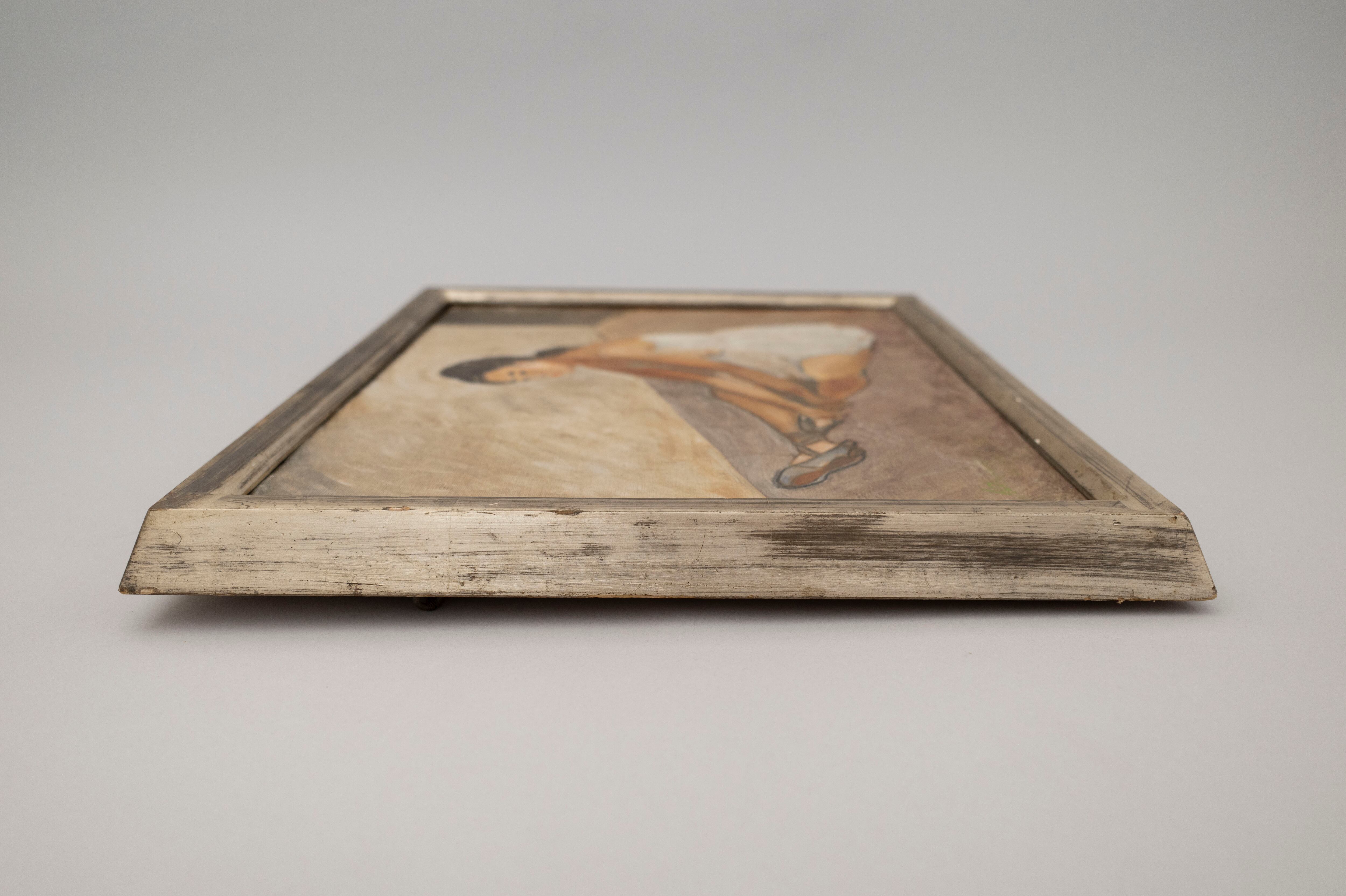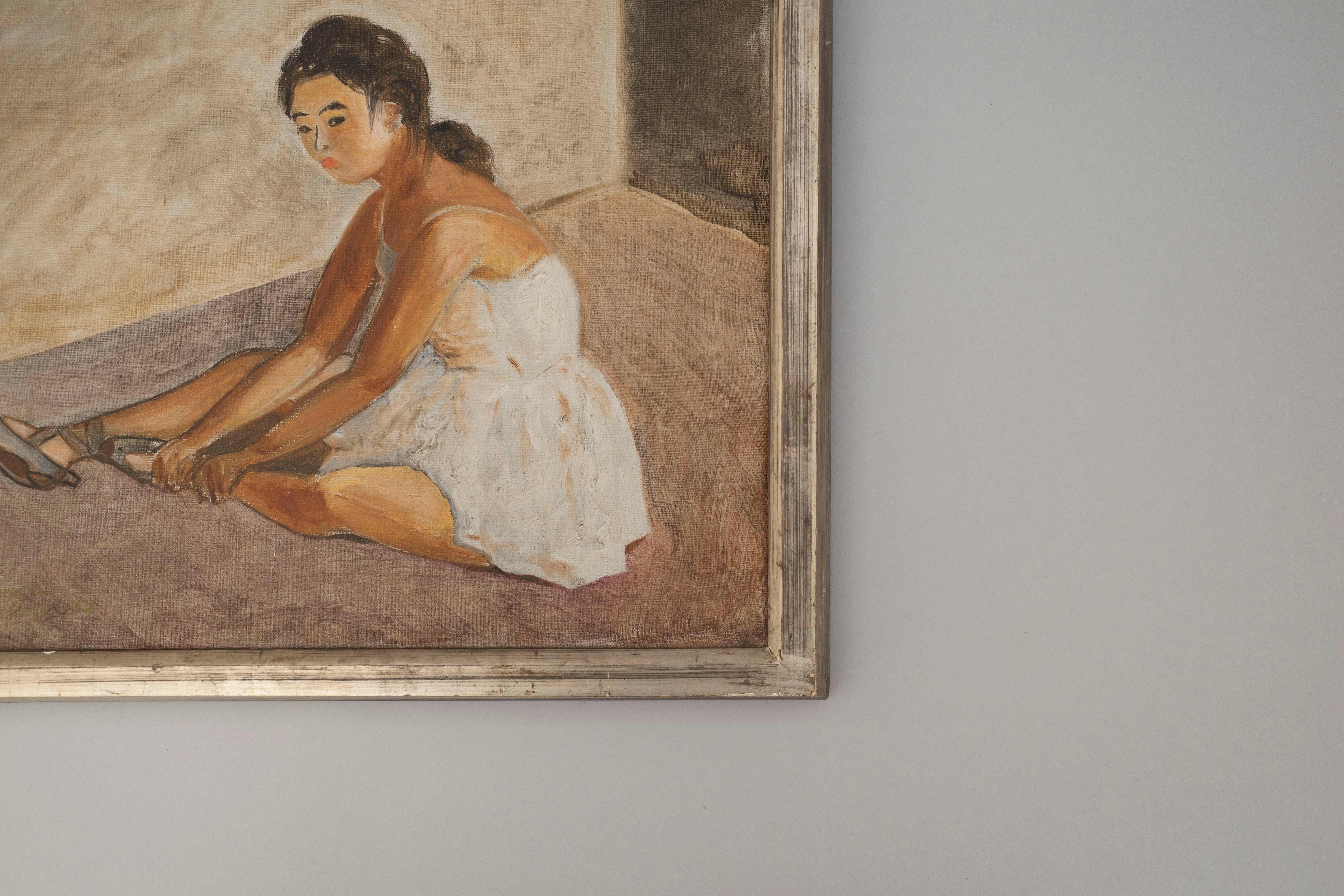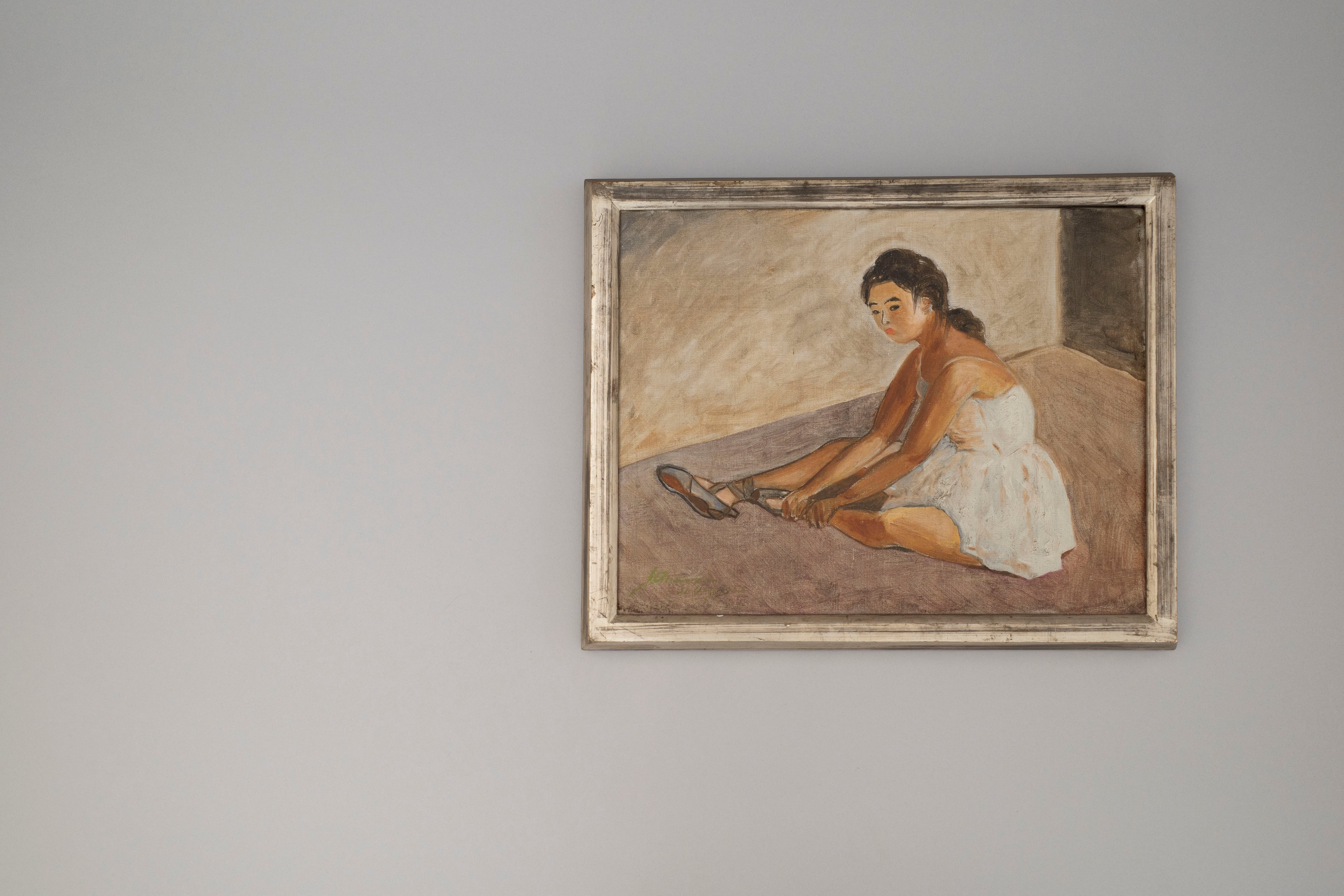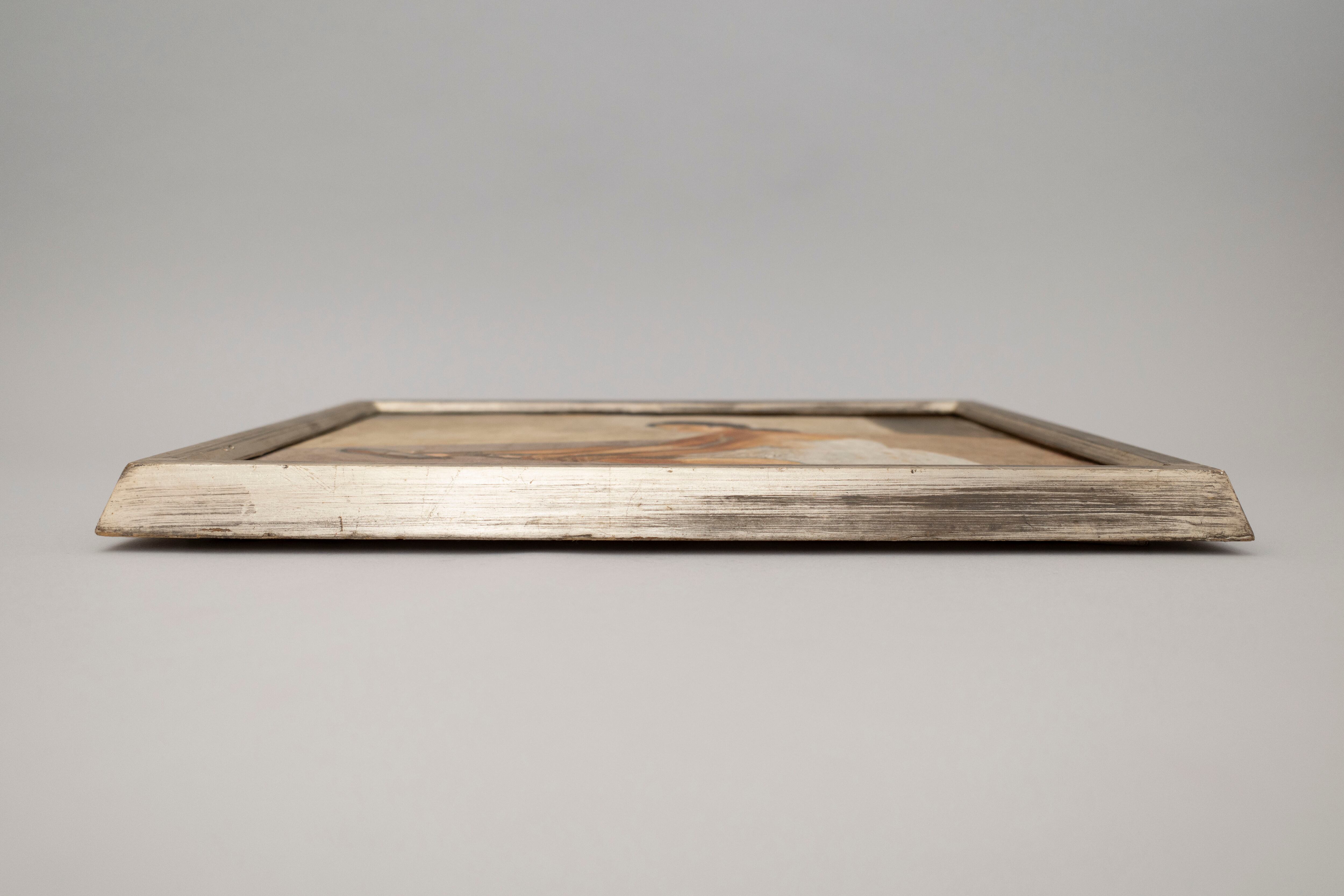 くすんだ銀の額とベージュの部屋が